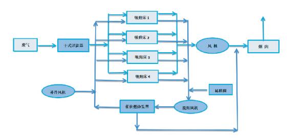 Špecifikácie adsorpčnej nádrže a množstvo náplne adsorbentu sú navrhnuté podľa objemu vzduchu, aby sa zabezpečila určitá rýchlosť plynu a doba zotrvania, aby adsorbent mohol účinne a úplne absorbovať organické rozpúšťadlo v koncovom plyne. Adsorpčná nádrž pracuje striedavo a pracovný stav adsorpčnej nádrže je automaticky prepínaný automatickým riadiacim systémom PLC, aby striedavo vykonával tri procesy adsorpcie, desorpcie, chladenia a sušenia atď.
